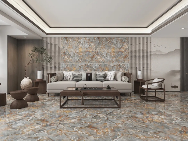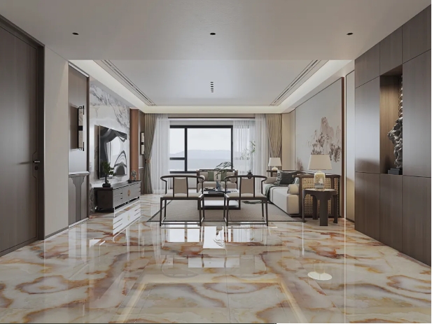 【玛吉特】整体大面积上墙铺地,打造出大气磅礴的视觉张力,搭配新中式风格的家居软装,将高级与优雅平衡融入,尽显居者不俗