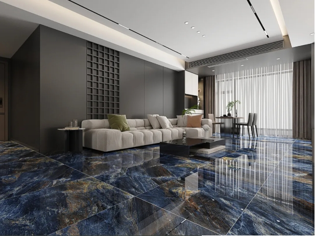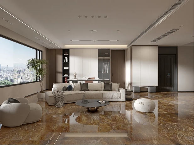 客厅选用【密尔沃】通铺于地面,以灰色为客厅的主调,恣意流淌的精致纹理,与窗外阳光交织互动,呈现高级、沉稳的雅致氛围。
